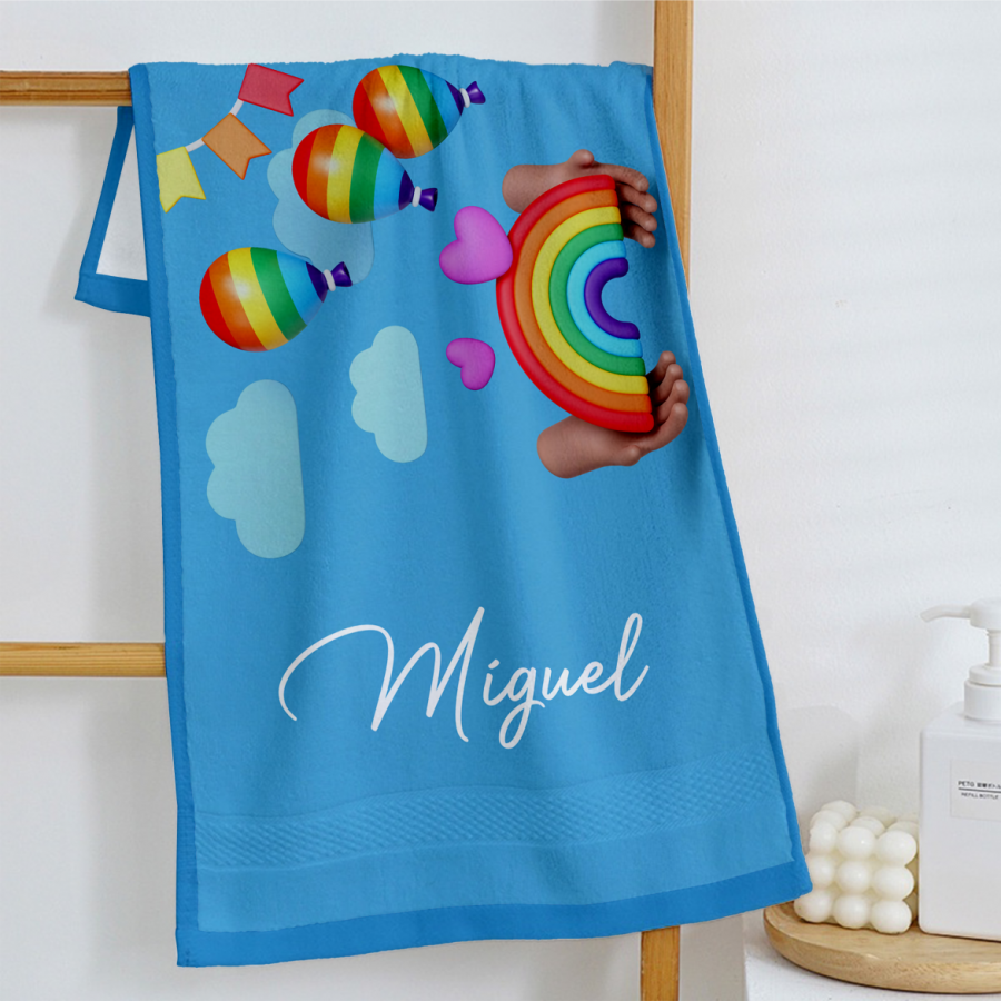 Toalha de rosto personalizada 73x48cm, em felpudo tropical 100% poliéster, gramatura 195g/m² e impressão Ultra-HD Epson. Toque macio, secagem rápida e cores vibrantes!