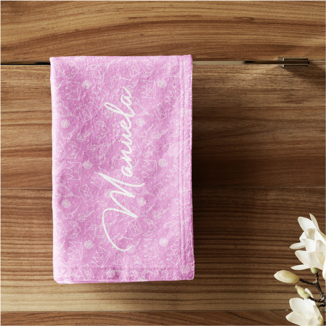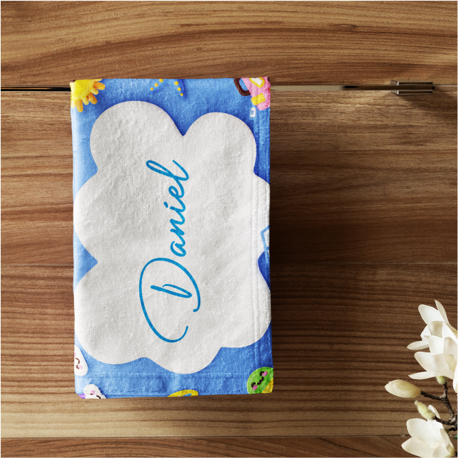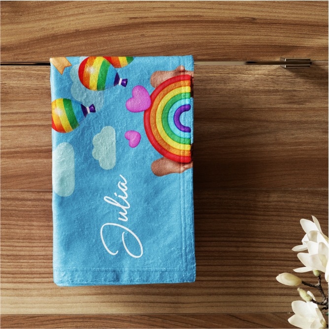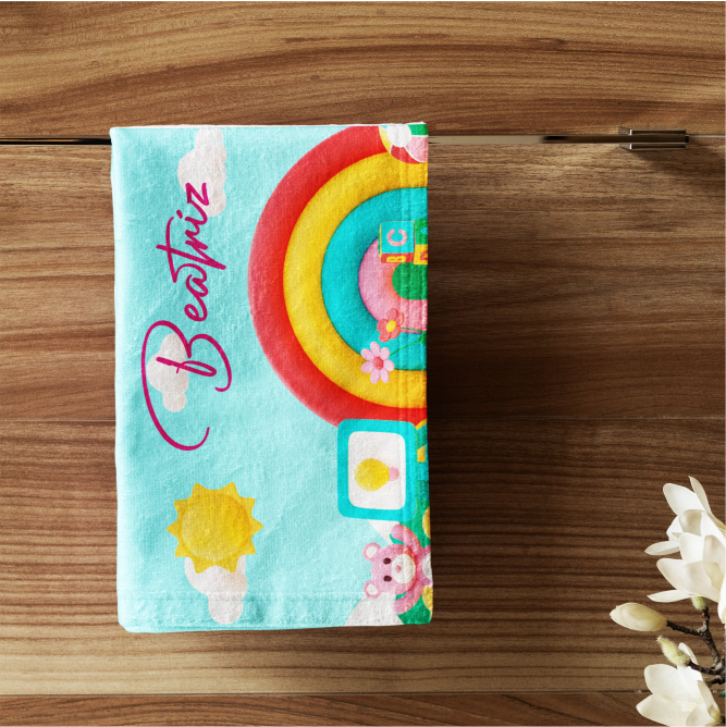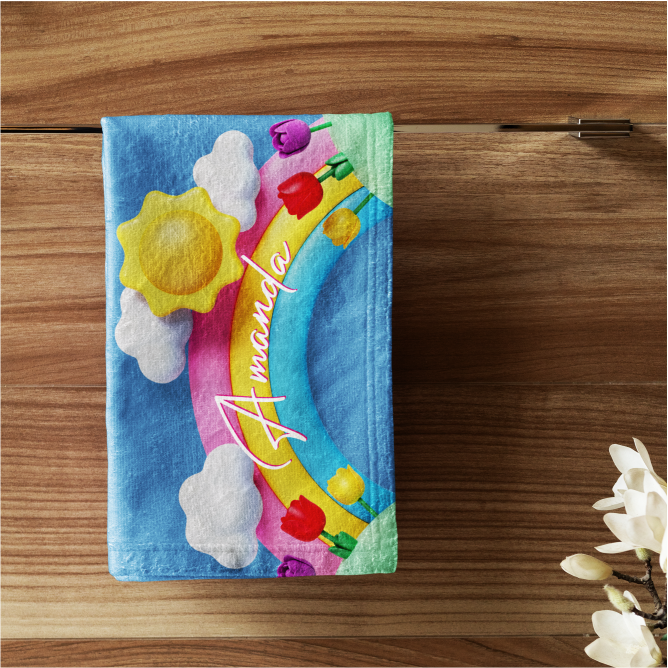 Toalha de rosto personalizada 73x48cm, em felpudo tropical 100% poliéster, gramatura 195g/m² e impressão Ultra-HD Epson. Toque macio, secagem rápida e cores vibrantes!